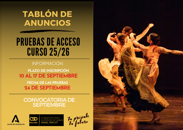 | Realización de las pruebas específicas | Día 24 de septiembre, en el Conservatorio Superior de Danza «Ángel Pericet» de Málaga. |